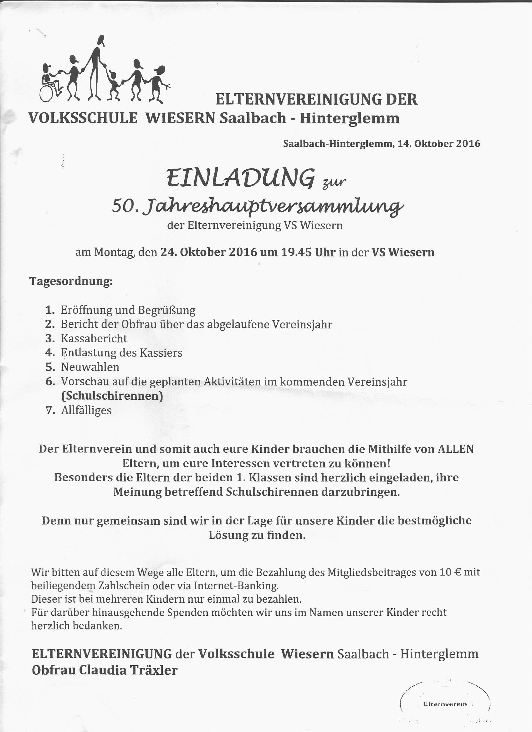 Einladung zur 50. Jahreshauptversammlung der Elternvereinigung der VS Wiesern